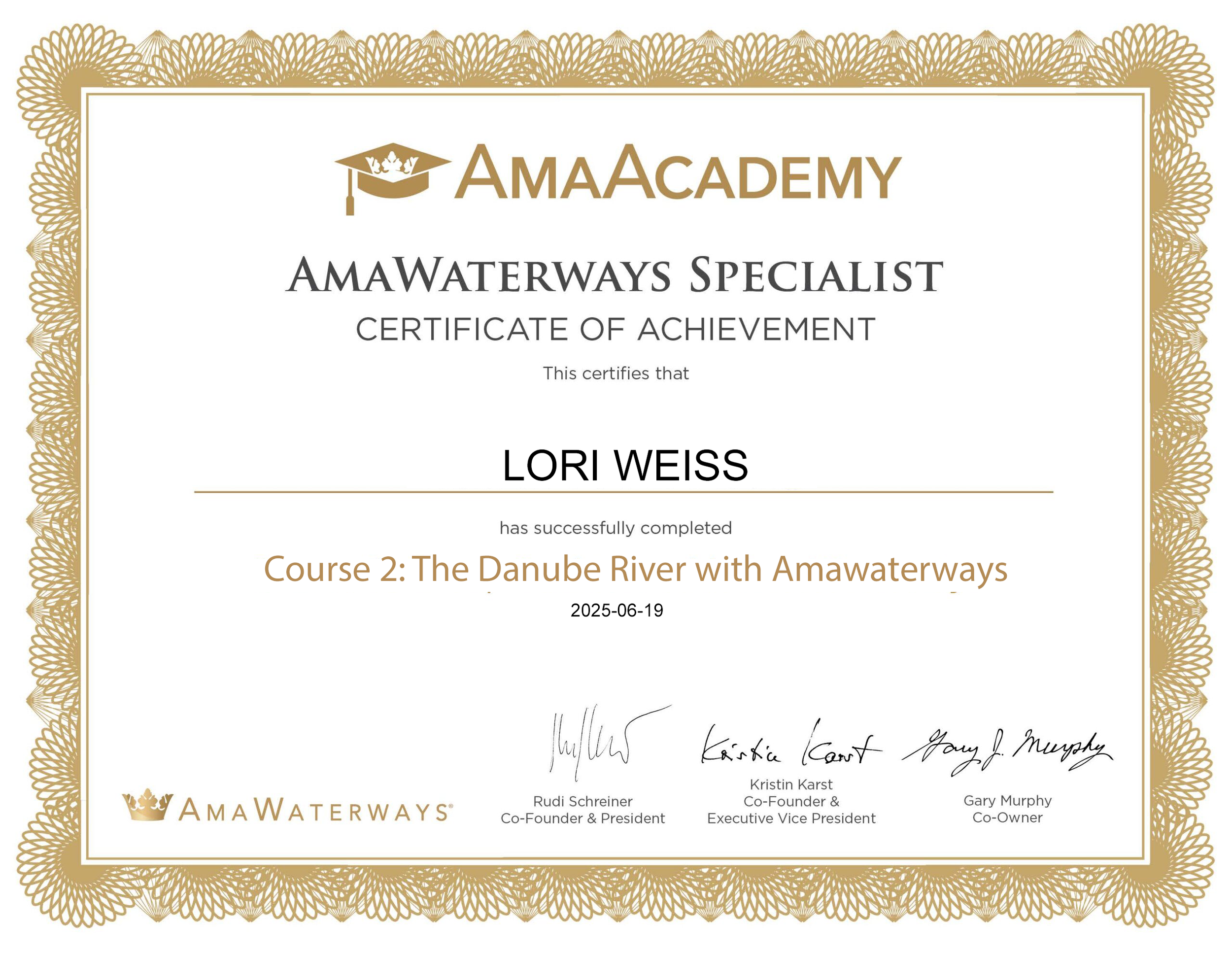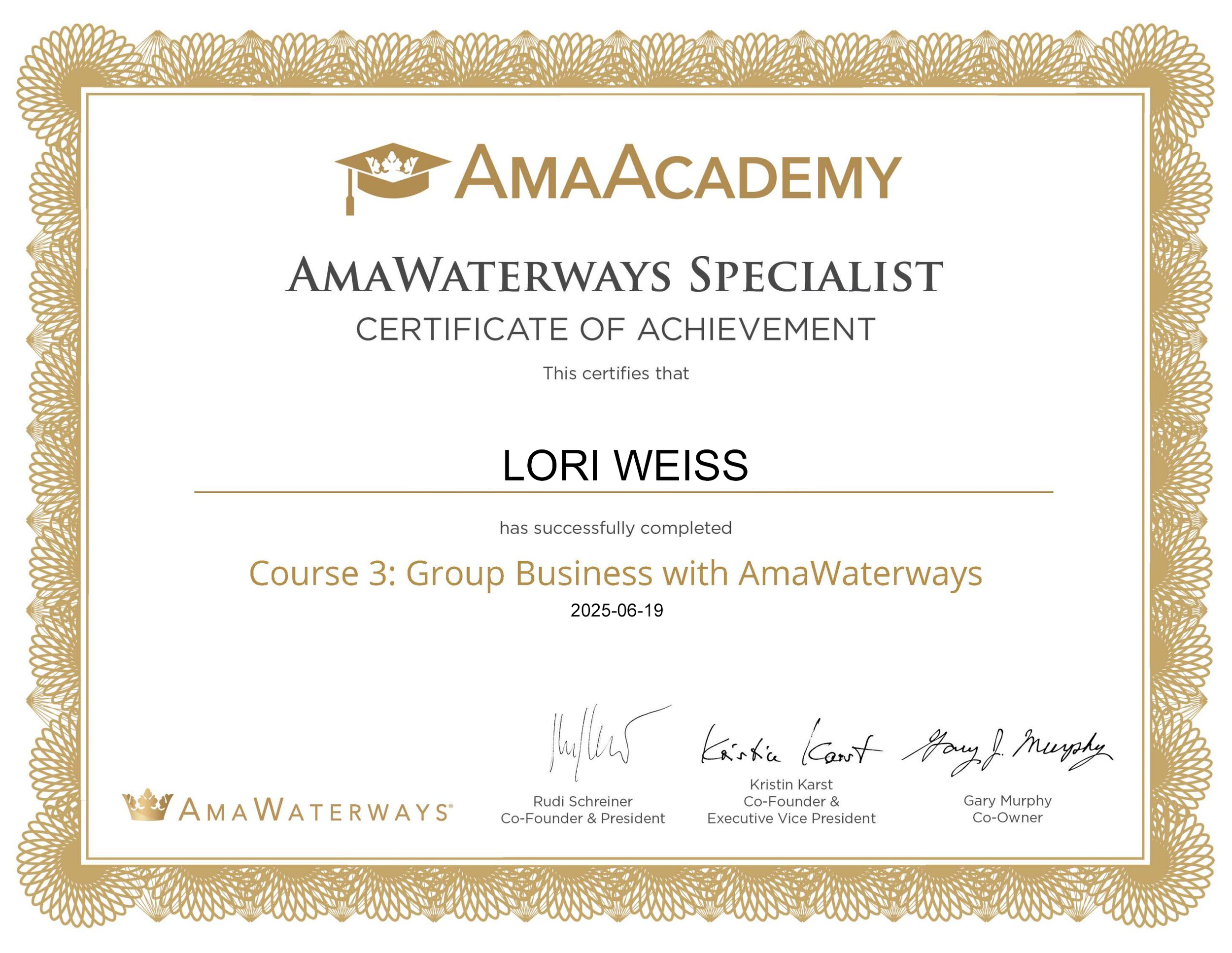 • Certificate of achievement awarded to Lori Weiss for completing Course 3: Group Business with AmaWaterways, dated June 19, 2025, with signatures at the bottom and a decorative gold border.